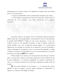 Adicionalmente, el tribunal ordenó que “como medida de reparación de la honra de la denunciante”, la dirección nacional del SML envíe un mail a todos los funcionarios de la Fiscalía, en este tenor: