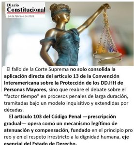 El fallo de la Corte Suprema (Rol N° 24.317-2025) no solo consolida la aplicación directa del artículo 13 de la Convención Interamericana sobre la Protección de los Derechos Humanos de las Personas Mayores, sino que reabre el debate sobre el “factor tiempo” en procesos penales de larga duración. En causas de DD.HH. tramitadas bajo un modelo inquisitivo y extendidas por décadas, el artículo 103 del Código Penal —prescripción gradual— opera como un mecanismo legítimo de atenuación y compensación, fundado en el principio pro reo y en el respeto irrestricto a la dignidad humana, eje esencial del Estado de Derecho.