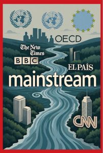La palabra mainstream significa literalmente “corriente principal”. En política y comunicación, describe a la red de medios de comunicación dominantes, organismos internacionales, centros de pensamiento y élites económicas que imponen una narrativa única y moldean la opinión pública. No lo hacen necesariamente a través de mentiras directas, sino seleccionando qué se dice, cómo se dice y quién tiene derecho a ser escuchado. Es una forma de poder blando: silenciosa, sofisticada y extremadamente efectiva.