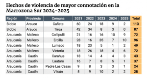En cuanto a la violencia, el estudio consigna que “según datos de Carabineros, de los 6.531 eventos asociados a la llamada ‘violencia rural’ registrados entre los años 2013 y 2021, un 56% de estos se concentran en alguna de las 10 comunas indicadas”.