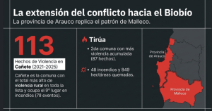 Cañete, en la provincia de Arauco (Región del Biobío), registró 78 incendios y 429 hectáreas afectadas, junto con 113 hechos de violencia rural entre 2021 y 2025, el total más alto del listado. Los 78 incendios registrados allí durante la temporada pasada la ubicaron en el noveno lugar entre las diez comunas con mayor número de incendios a nivel macrozonal. En tanto, Tirúa –que es la segunda comuna que más hechos de violencia acumula entre 2021 y 2025– sumó 87 hechos de violencia en el período analizado y registró 48 incendios, con 849 hectáreas quemadas, durante la última temporada.